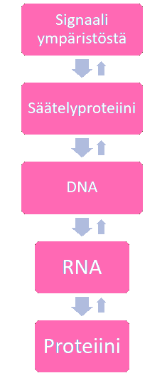 Tämä kuva on kuitenkin puutteellinen. Vaikka geenit luovatkin tietyt raamit organismin toiminnalle, organismin biologia määräytyy ensisijaisesti ympäristötekijöiden perusteella. Nämä ympäristöstä tulevat signaalit vaikuttavat DNA:n säätelyproteiineihin ja siten geenien ilmentymiseen. Geenien ilmentymisellä tarkoitetaan sitä, onko jokin geeni aktiivinen vai ei, eli tuottaako se sitä vastaavaa proteiinia vai ei, vai vaihtelevassa määrin. Jos geeni on aktiivinen, tuottaa solu geeniä vastaavaa proteiinia. Informaation kulku on rajatuissa määrin mahdollista myös toiseen suuntaan. Täten epigeneettiset muutokset, eli esim. muutokset kromosomien pakkautumisessa ja DNA:n metylaatiossa, jotka eivät mitenkään vaikuta itse DNA-sekvenssiin, vaikuttavat DNA:ta säätelevien proteiinien toimintaan ja siten geenien ilmentymiseen. (B. Lipton 2015, p. 35-46)